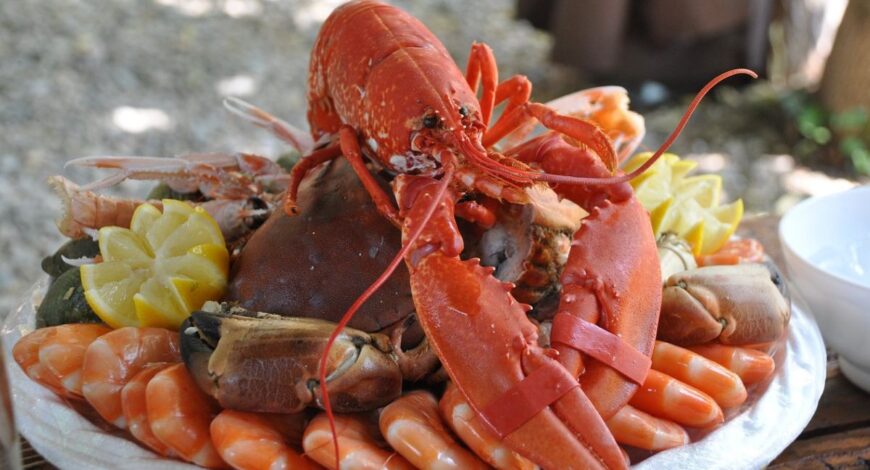 - Langosta: Considerada un manjar de lujo. Su carne, principalmente en la cola y las pinzas, es firme, dulce y mantecosa. Se prepara hervida, a la parrilla o a la mantequilla.